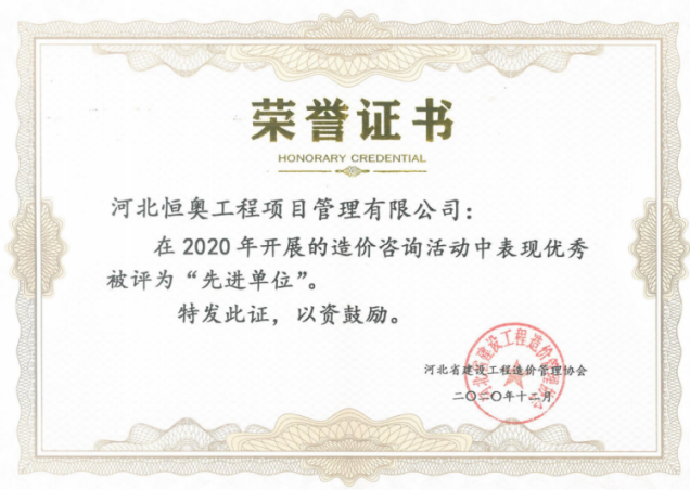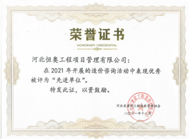 公司在 2020 年、2021 年榮獲造價咨詢先進(jìn)單位榮譽(yù)證書;在 2021 年榮 獲高新技術(shù)企業(yè)證書;在 2022 年、2024年榮獲 5A 級計(jì)價信用承諾認(rèn)定榮譽(yù)證書、榮獲河北省建筑市場發(fā)展研究會第四屆理事單位榮譽(yù)證書以及河北省質(zhì)量信譽(yù)先進(jìn)單位榮譽(yù)證書。2023年參與編寫了河北省工程建設(shè)團(tuán)體標(biāo)準(zhǔn)《建設(shè)工程造價爭議評審規(guī)范》(T/HECA001-2023)。